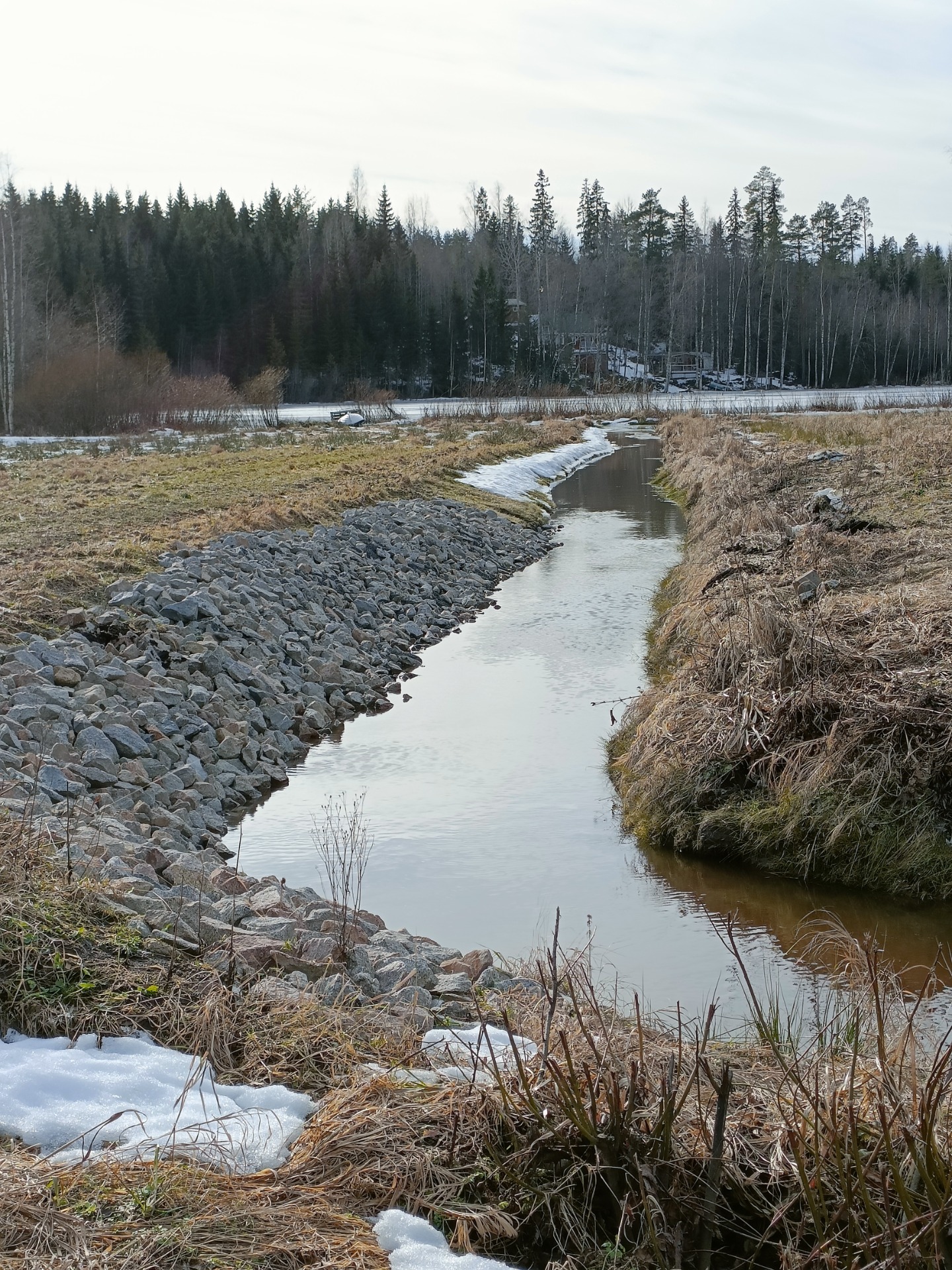 Alla kuva uoman eroosiosuojauksen jatkamisesta. Kivetystä jatkettiin kevättalvella noin 10 metriä eroosion estämiseksi. Vedenlaadun miittauksista löytyy raportti täältä:Pitkäjärven veden laatua seurataan